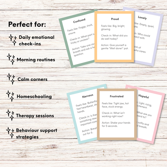 This range includes beautifully illustrated emotion check-in cards, calming tools, and uplifting affirmation cards, all created to help children recognise, express, and regulate their feelings with confidence.
